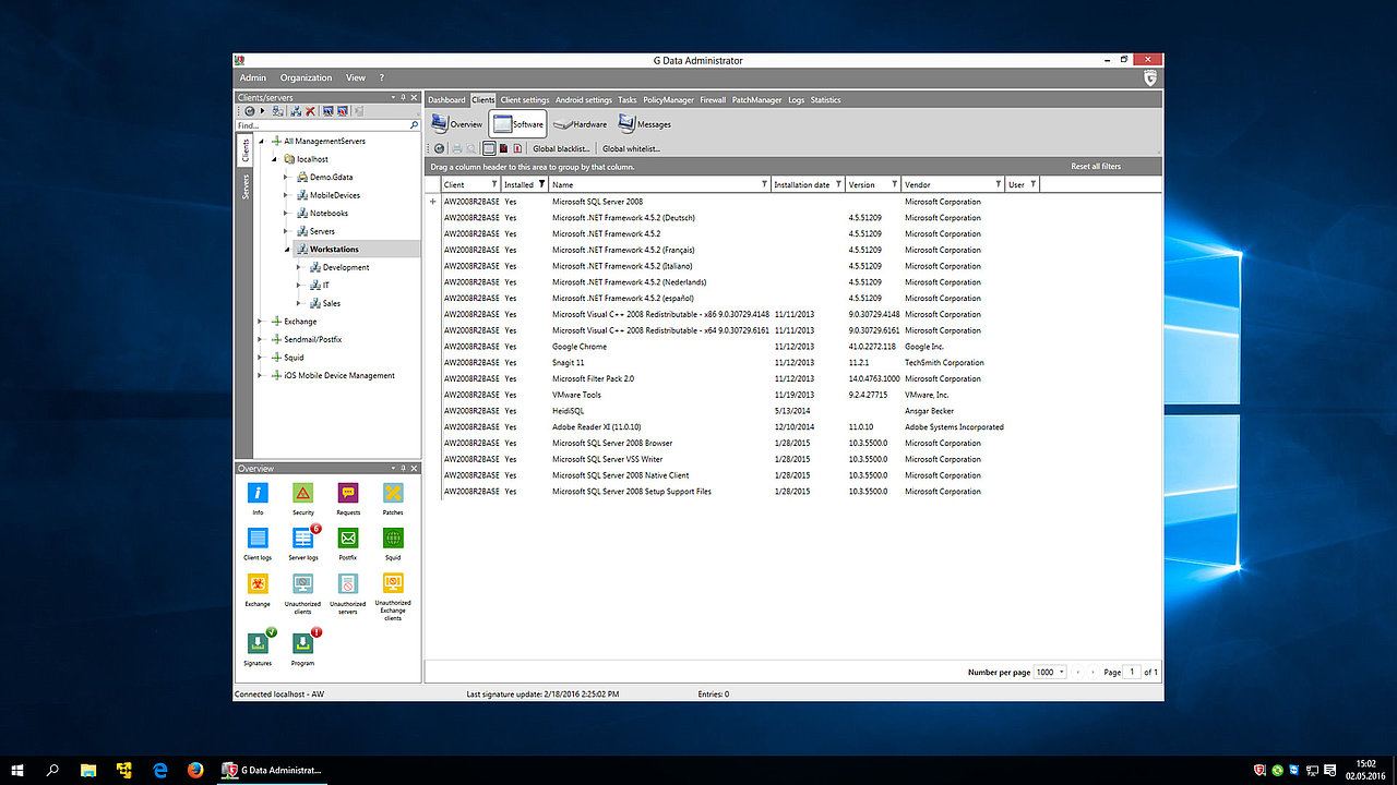 De softwarelijst van uw G DATA bedrijfsoplossing geeft u een overzicht van de geïnstalleerde software op de clientcomputers. Hier kunt u bijvoorbeeld ook nagaan welke Windows-versies in gebruik zijn.
