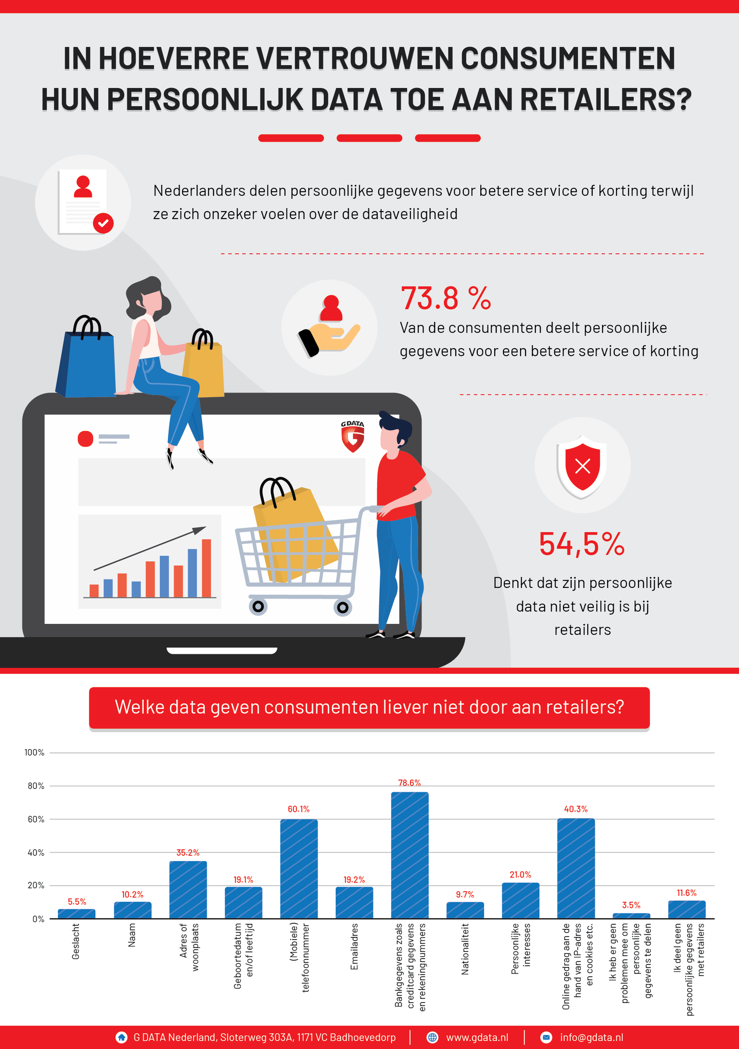 Meer dan de helft (54,5%) van de Nederlanders denkt dat hun persoonlijke data niet veilig is bij retailers. Desondanks deelt 73.8 procent persoonlijke data met (online) retailers voor een betere service en/of acties. Dit blijkt uit een onderzoek van G DATA, de innovatieve pionier op het gebied van IT-beveiliging en partner van Alert Online. Het onderzoek is opgezet in het kader van de European Cyber Security Month en verricht onder meer dan 1000 Nederlanders.